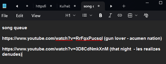 https://files.catbox.moe/cxyryk.png this is what the "queue" looks like currently. submitted songs will be added every other day for as long as I have them